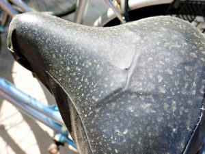 外に置いたロードバイクに花粉や黄砂が付着した状態で雨や朝露に濡れると、水分を含んだ花粉が粘着質になり、黄砂と混ざってフレームやチェーン、スプロケットにこびりついてしまいます。
